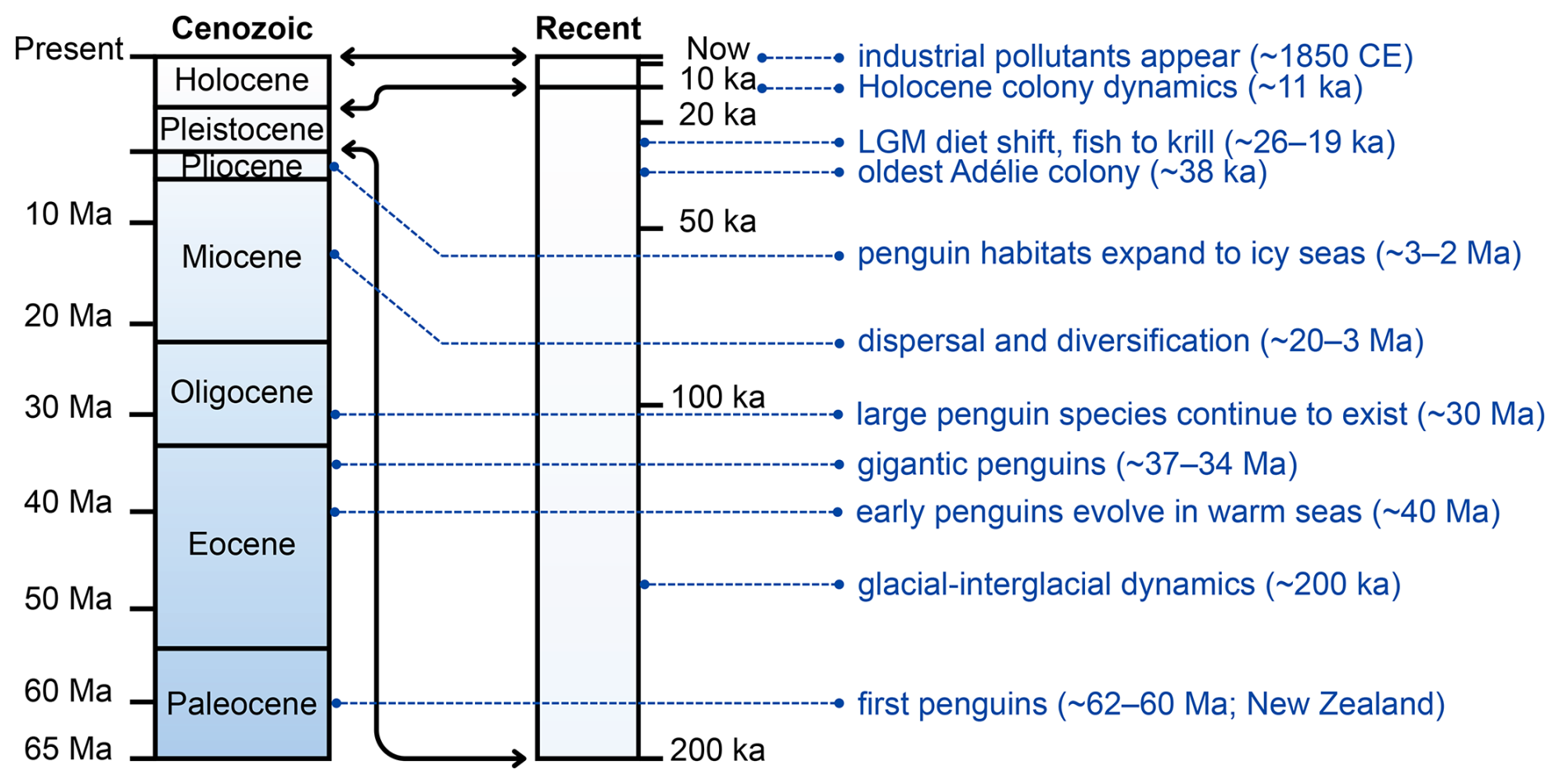 Figure 1Geologic timeline of penguin evolution and environmental archives from the Paleocene to the present. The vertical axis represents time, with bands highlighting the Paleocene to the modern periods. Key milestones include the earliest stem penguins in the Paleocene (Waimanu manneringi and W. tuatahi (= Muriwaimanu tuatahi) from the Waipara Greensand Formation, Canterbury, New Zealand), giant fossil species on Seymour Island during the Eocene–Oligocene (Marples, 1953; Jadwiszczak, 2006; Xia et al., 2024) when Antarctic seas were warmer and largely ice free (Martin, 2009; Stilwell and Long, 2011), and diversification and dispersal during the Miocene–Pliocene (Ksepka and Clarke, 2010). Late Quaternary archives include radiocarbon-dated colony remains (bones, eggshells, guano) that record occupation history and environmental change, such as the oldest known Adélie colony at Cape Adare (∼ 38 ka) (Baroni and Orombelli, 1994; Emslie, 2001), diet shifts during the Last Glacial Maximum (∼ 26–19 ka) inferred from stable isotopes (Emslie and Patterson, 2007; Sun et al., 2000), and guano and eggshell records tracing Holocene colony dynamics (Huang et al., 2009). Industrial-era pollutants (since the determination of colonies after ∼ 1850 CE; Xu et al., 2020) illustrate the most recent environmental signals preserved in penguin tissues and deposits. Abbreviations: Ma = million years ago; ka = thousand years ago; CE = Common Era; LGM = Last Glacial Maximum.