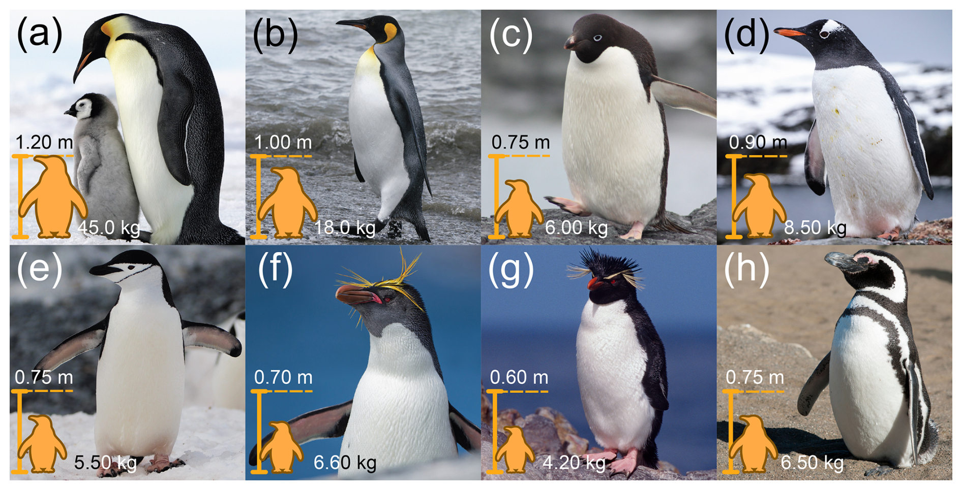 Figure 2Representative Antarctic and sub-Antarctic penguin species included in this overview: (a) emperor (A. forsteri), (b) king (A. patagonicus), (c) Adélie (P. adeliae), (d) gentoo (P. papua), (e) chinstrap (P. antarctica), (f) macaroni (E. chrysolophus), (g) southern rockhopper (E. chrysocome), and (h) Magellanic (S. magellanicus). Approximate adult maximum height (m) and body mass (kg) are compiled from species summaries by the World Wide Fund for Nature (WWF, 2026). Penguin images are publication-licensed stock illustrations from Canva (Canva for Education), assembled by the author; used under the Canva Content License Agreement (https://www.canva.com/en_in/policies/content-license-agreement/, last access: 16 March 2026) for online or electronic publication and for non-commercial purposes.