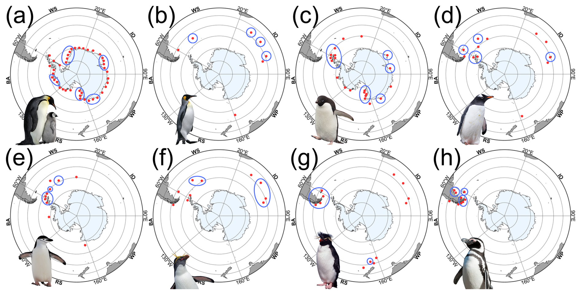 Figure 3Approximate breeding distributions of Antarctic and sub-Antarctic penguins. Maps created by the author in R; distributions adapted from De Roy et al. (2022) and supplemented by published literature (e.g., Fretwell et al., 2012; Lynch and LaRue, 2014; Fretwell and Trathan, 2021). Penguin images are publication-licensed stock illustrations from Canva (Canva for Education), assembled by the author; used under the Canva Content License Agreement (https://www.canva.com/en_in/policies/content-license-agreement/) for online or electronic publication and for non-commercial purposes. Red points mark known breeding sites or colonies, whereas blue circles highlight major population strongholds. Species panels: (a) emperor (A. forsteri), (b) king (A. patagonicus), (c) Adélie (P. adeliae), (d) gentoo (P. papua), (e) chinstrap (P. antarctica), (f) macaroni (E. chrysolophus), (g) southern rockhopper (E. chrysocome), and (h) Magellanic (S. magellanicus). Sector labels correspond to standard Southern Ocean regions following Parkinson (2019): RS = Ross Sea, BA = Bellingshausen–Amundsen Seas, WS = Weddell Sea, IO = Indian Ocean sector, WP = West Pacific sector. The outer ring corresponds to 30° S, with inner concentric rings every 10° of latitude.