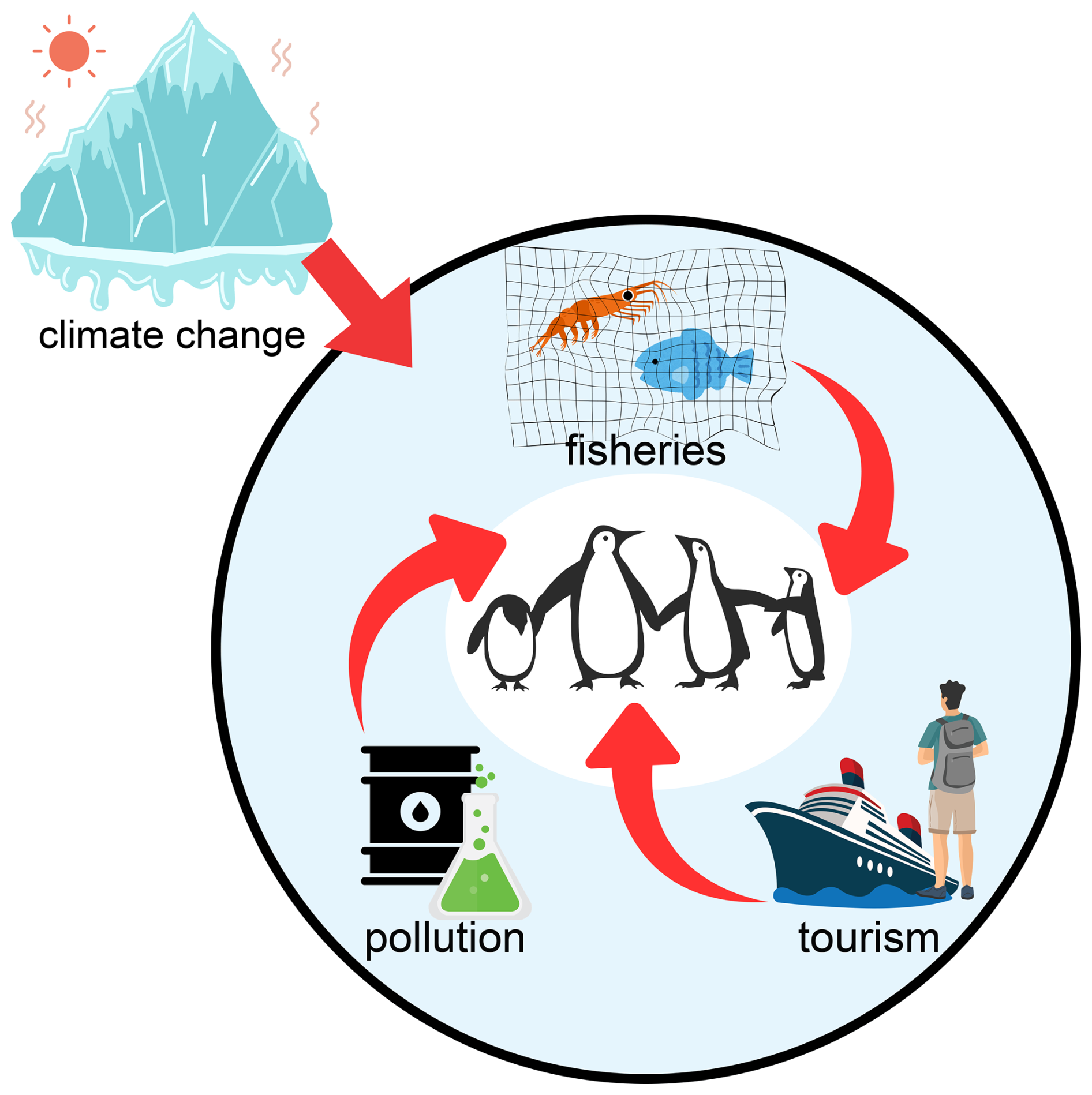 Climate change is not the only driver of change in penguin populations. Penguins also face direct human pressures that can amplify climate-driven risks because they often act on the same bottlenecks: food availability, safe breeding space, and survival during energetically demanding periods.