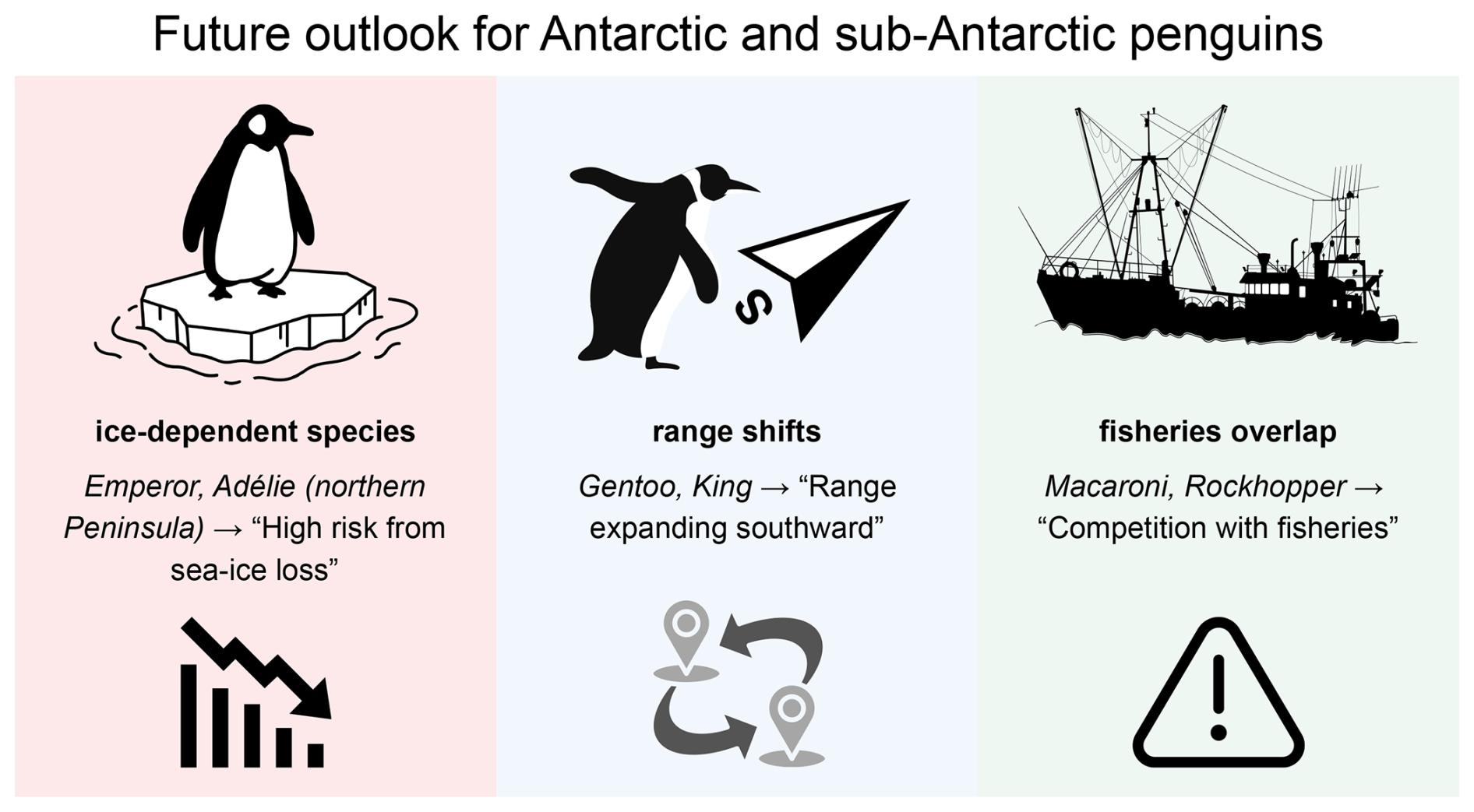 The narrative then moves to the present. Today's penguins are the extant outcome of past diversification and turnover, and they occupy a wide range of Southern Ocean habitats. Here, eight Antarctic and sub-Antarctic breeders are used as focal species to compare status, pressures, and the mechanisms most likely to shape near-future change.