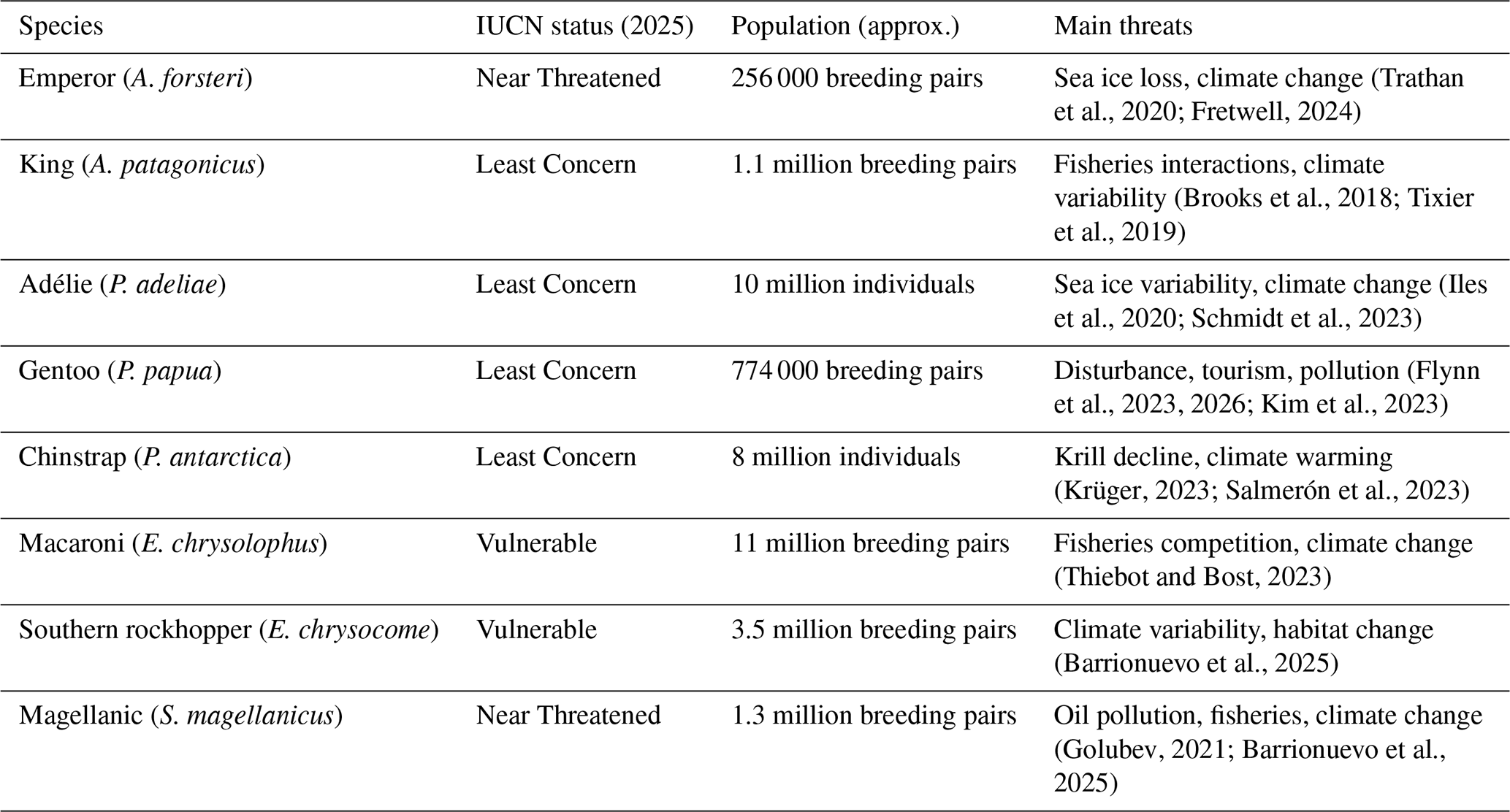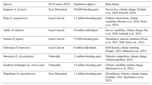 (Trathan et al., 2020; Fretwell, 2024)(Brooks et al., 2018; Tixier et al., 2019)(Iles et al., 2020; Schmidt et al., 2023)(Flynn et al., 2023, 2026; Kim et al., 2023)(Krüger, 2023; Salmerón et al., 2023)(Thiebot and Bost, 2023)(Barrionuevo et al., 2025)(Golubev, 2021; Barrionuevo et al., 2025)Table 1Conservation status, approximate global population size, and principal threats for Antarctic and sub-Antarctic penguin species. Population estimates and conservation status follow the most recent IUCN Red List and BirdLife International assessments (IUCN, 2023; BirdLife International, 2023). Species-specific threat evidence is supported by recent ecological and conservation studies (see citations in table).