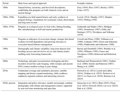 Because many penguins nest in dense colonies that are visible from the ground, air, and satellites, their distributions can be mapped and updated more consistently than those of many other marine predators (Fretwell et al., 2012; Fretwell and Trathan, 2021). This makes penguins especially useful for detecting changes in where and when the Southern Ocean can support high predator demand, and it provides a practical baseline for the future projections discussed in Sect. 5.