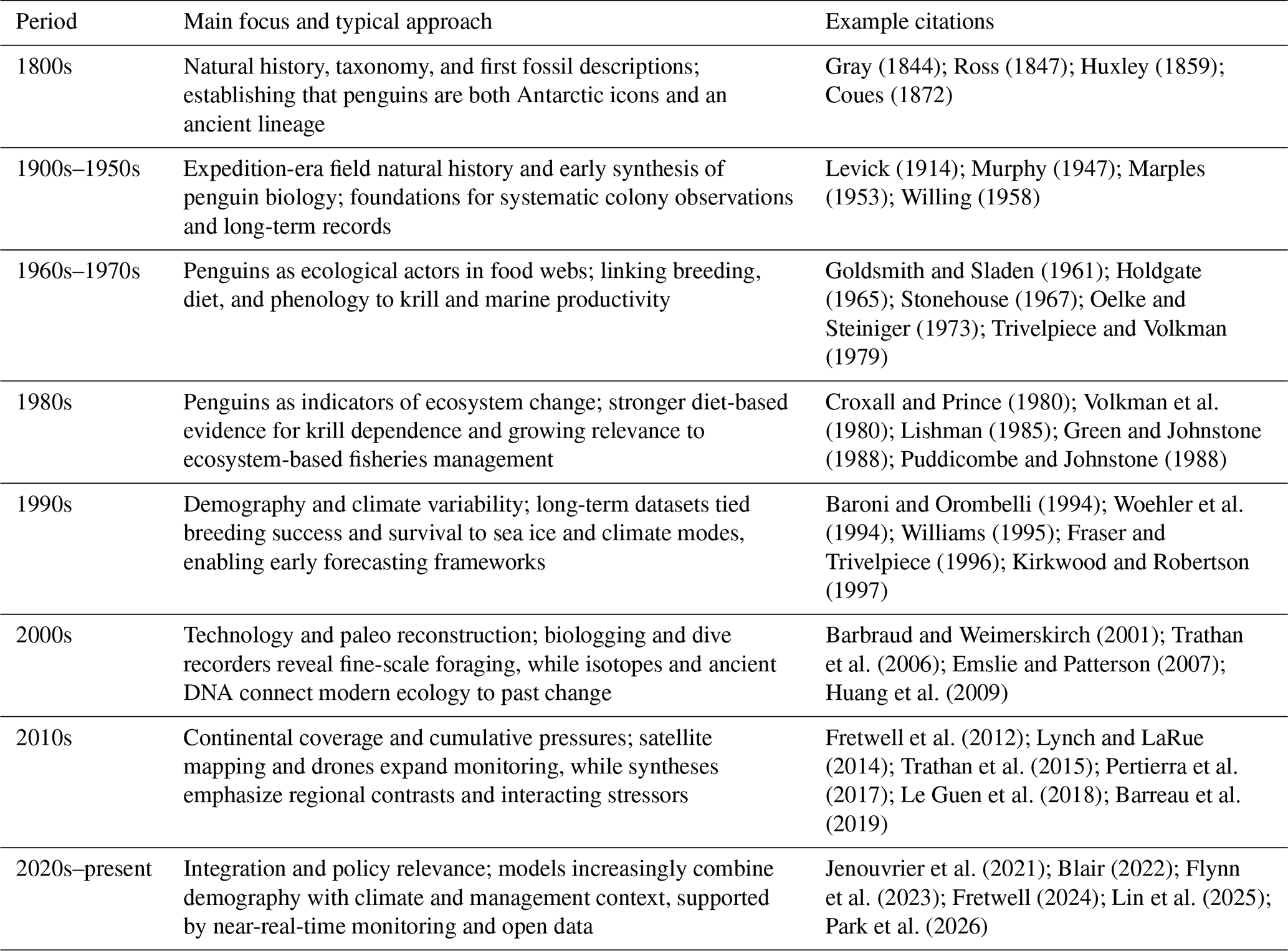The evidence reviewed in this section shows that penguins provide a rare, time-continuous archive of Southern Ocean change. Fossils document early origins and major radiations, including diverse large-bodied forms during warm Eocene conditions, followed by turnover and persistence as Antarctica cooled and became ice dominated. Quaternary records and genetic evidence show repeated range shifts and demographic change through glacial cycles, while Holocene colony deposits and geochemistry record fluctuations in colony occupancy, diet, and ecosystem structure as sea ice and productivity varied. In the modern era, penguin-derived materials also preserve signals of direct human influence, including industrial contaminants.